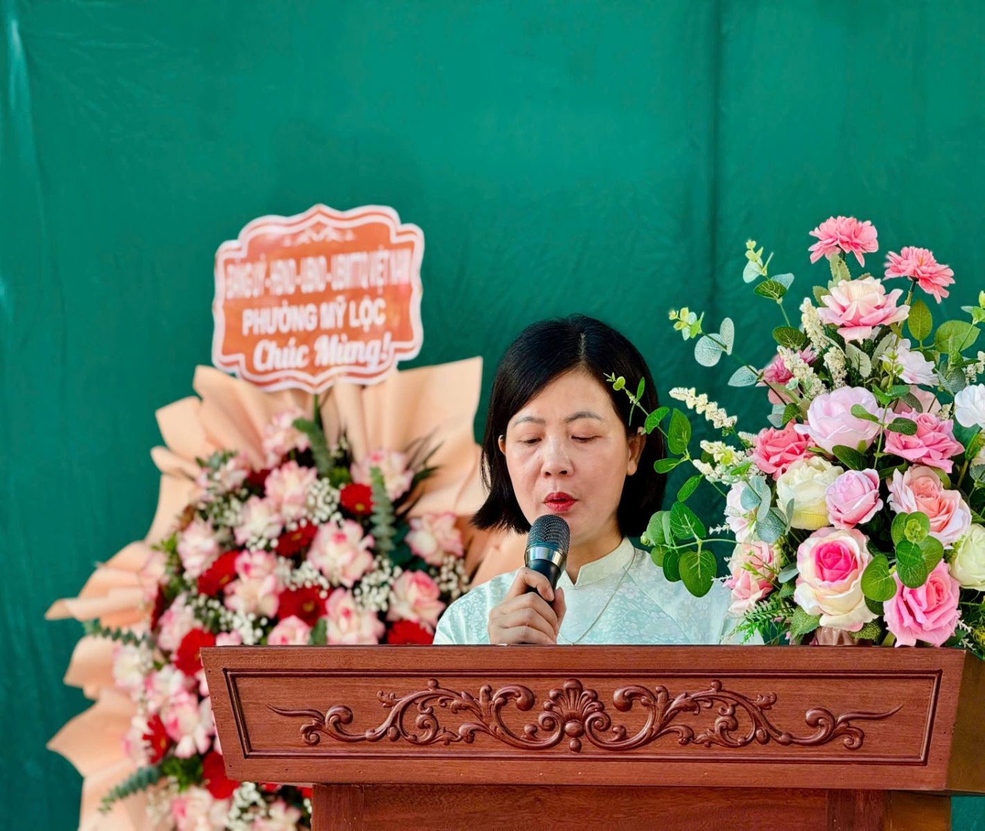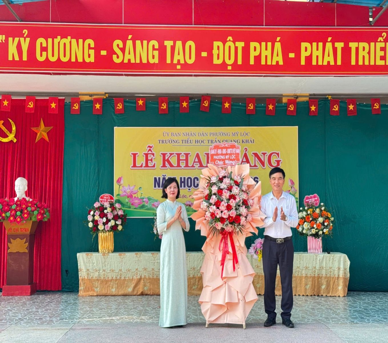 Buổi lễ vinh dự được đón tiếp đồng chí Đào Văn Quảng – Ủy viên Ban Thường vụ Đảng ủy, Phó Chủ tịch HĐND phường Mỹ Lộc; đồng chí Bùi Nam Trung – cán bộ phòng Văn hóa – Xã hội; đại diện cha mẹ học sinh cùng toàn thể cán bộ, giáo viên, nhân viên và học sinh nhà trường. Sự hiện diện của quý đại biểu là niềm vinh dự, đồng thời là nguồn động viên to lớn, thể hiện sự quan tâm sâu sắc của Đảng ủy, chính quyền và nhân dân địa phương đối với sự nghiệp giáo dục.